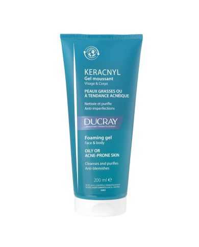 • Le gel moussant KERACNYL est un nettoyant visage & corps quotidien adapté pour l’hygiène des peaux grasses et/ou à tendance acnéique des adolescents comme des adultes